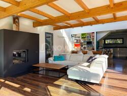 Dans un cadre arboré en zone naturelle, cette villa d'architecte profite d'un bel environnement et d'un joli point de vue sur les Pyrénées. Équipée de grandes baies vitrées, c'est une villa très lumineuse qui offre de belles vues sur l'extérieur. Le séjour, pensé comme un cocon vitré, ouvre sur une spacieuse terrasse en bois avec pergola et est équipé d'un insert Stuv pour faire de belles flambées en hiver. La cuisine est d'excellente qualité et dispose d'un cellier buanderie attenant. Reparties dans plusieurs ailes de la maison, cette villa offre au rez-de-chaussée trois chambres confortables dont une grande suite parentale, et une salle de bain supplémentaire. L'étage se compose d'un grand bureau en mezzanine ainsi que d'une chambre avec sa salle d'eau attenante. Les espaces de rangement sont nombreux et la villa dispose d'un garage de rangements, d'un abri de jardin et d'un carport pour deux voitures.