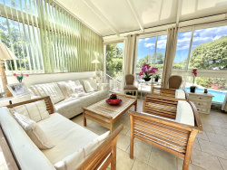 Dans un quartier recherché, calme et résidentiel, découvrez cette élégante villa individuelle aux volumes généreux, baignée de lumière et ouverte sur un cadre naturel préservé. Nichée au coeur d'un jardin arboré à la végétation luxuriante, elle offre une superbe vue panoramique. Édifiée sur une parcelle de 2 163 m2 exposée sud-ouest, cette maison offre une surface habitable d'environ 234 m2 répartie sur deux niveaux, agencés comme suit : Le rez-de-chaussée allie confort et fonctionnalité pour une vie de plain-pied particulièrement agréable. Vous y découvrirez une vaste pièce de vie de 50 m2 orientée sud-ouest s'ouvrant sur deux larges terrasses, une cuisine indépendante ainsi qu'une véranda baignée de lumière, surplombant la piscine. Trois chambres, deux salles d'eau avec WC, une buanderie et de nombreux rangements viennent parfaire ce niveau. L'étage, accessible par un escalier extérieur, constitue un espace indépendant, idéal pour accueillir famille ou amis. Il se compose de deux grandes chambres de 15 et 19 m2, dont l'une ouvre sur une terrasse offrant un charmant aperçu mer. Une salle d'eau avec WC ainsi que deux pièces en enfilade à aménager selon vos envies en séjour, chambres supplémentaires ou bureau viennent compléter cet espace polyvalent. Un spacieux sous-sol, un local technique ainsi que plusieurs places de stationnement complètent ce bien. La villa est équipée de climatisations réversibles pour un confort optimal. Cette propriété présente un potentiel remarquable pour concrétiser tous vos projets ! Contactez-nous pour organiser une visite