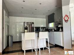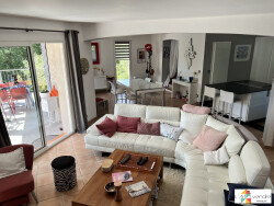 La villa est composée comme suit : salon-séjour avec sa cuisine ouverte meublée et équipée (four, plaque induction avec hotte aspirante intégrée dans le plan de travail, un lave vaisselle, Un micro ondes, un frigidaire américain) donnant accès à la grande terrasse carrelée où se trouve en contre bas une piscine Desjoyaux de 9.50 x 4.50 au chlore avec liner et son dôme rétractable motorisé. Une cheminée insert bois et climatisation réversible. Un dégagement avec placard depuis l'entrée dessert deux chambres avec placards ainsi qu'une salle d'eau, et un wc suspendu indépendant avec son lave mains. Un accès par l'intérieur permet d'accéder à la buanderie située en rez-de-de jardin et son bureau à l'étage sous mansarde avec velux. A l'étage un palier avec fenêtre desservant une suite parentale avec sa salle de bain attenante (baignoire, wc, meuble lavabo).