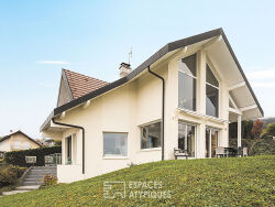 Sur les hauteurs de Lugrin, cette villa contemporaine de 2003 déploie une surface utile d'environ 344 m² pour 195 m² habitables au coeur d'un écrin paysager de 2 158 m² offrant un panorama spectaculaire sur le lac Léman. Dès l'entrée, le regard est captivé par les volumes de la pièce de vie sous charpente cathédrale où la lumière traverse de part en part un parquet en hêtre clair animé par une cheminée design. Ce vaste espace de réception intègre une cuisine ouverte élégante et conviviale, prolongée par un bureau tourné vers l'horizon et une suite parentale complète avec dressing et salle de bains pour un confort de plain-pied. Un escalier de bois et d'acier conduit à l'étage où une mezzanine baignée de soleil dessert trois chambres paisibles, dont deux profitent d'une terrasse orientée au sud, ainsi qu'une salle d'eau moderne. Le niveau inférieur a été intégralement aménagé pour offrir une autonomie totale aux invités grâce à une chambre d'appoint, un salon indépendant et une salle d'eau. Les prestations haut de gamme se poursuivent avec une salle de sport ou home-cinéma, une cave à vin, une lingerie et un double garage sécurisé. A l'extérieur, le jardin parfaitement entretenu accueille une piscine au sel chauffée qui semble se confondre avec les eaux du lac, ainsi qu'un authentique petit chalet de 17 m² faisant office d'abri de jardin. Située à seulement 10 minutes d'Évian, de son golf et du débarcadère pour la Suisse, cette propriété d'exception allie la sérénité d'un environnement idyllique à la proximité immédiate des stations de ski et des commodités. Ce bien rare représente une opportunité unique de vivre l'architecture contemporaine face au plus grand lac d'Europe. CLASSE ENERGIE : D / CLASSE CLIMAT : B Montant moyen estimé des dépenses annuelles d'énergie pour un usage standard, établi à partir des prix de l'énergie des années 2021, 2022 et 2023 : entre 3540 euros et 4830 euros. Les informations sur les risques auxquels ce bien est exposé sont disponibles sur le site Géorisques : www.georisques.gouv.fr Contact : Karine - 06 14 98 51 52 Karine ZEGRIR (EI) Agent Commercial - Numéro RSAC : 912 532 421 - THONON LES BAINS.
