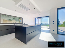 Au rez-de-chaussée, vous disposez d'une immense pièce de vie baignée de lumière disposant d'une belle cheminée d'angle et ouvrant directement sur une vaste cuisine aménagée et équipée. Vous trouverez également une grande buanderie, une cave à vin vitrée, une suite parentale et des toilettes indépendantes. Ce niveau est totalement tourné vers l'espace extérieur et vous permettra de profiter de la vue dégagée mais également d'une piscine à l'abri des regards.