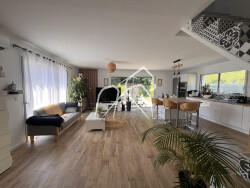 Cette maison est disposée comme suit : Au rez-de-chaussée : Une belle entrée Un double séjour traversant de 40 m² ouvrant sur terrasse et piscine Une cuisine ouverte toute équipée Une suite parentale avec salle d'eau avec WC et dressing Un WC indépendant A l'étage : Trois autres chambres lumineuses Une grande salle de bain avec baignoire, douche à l'italienne Un WC indépendant