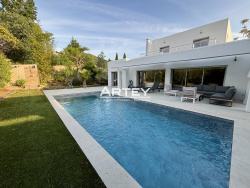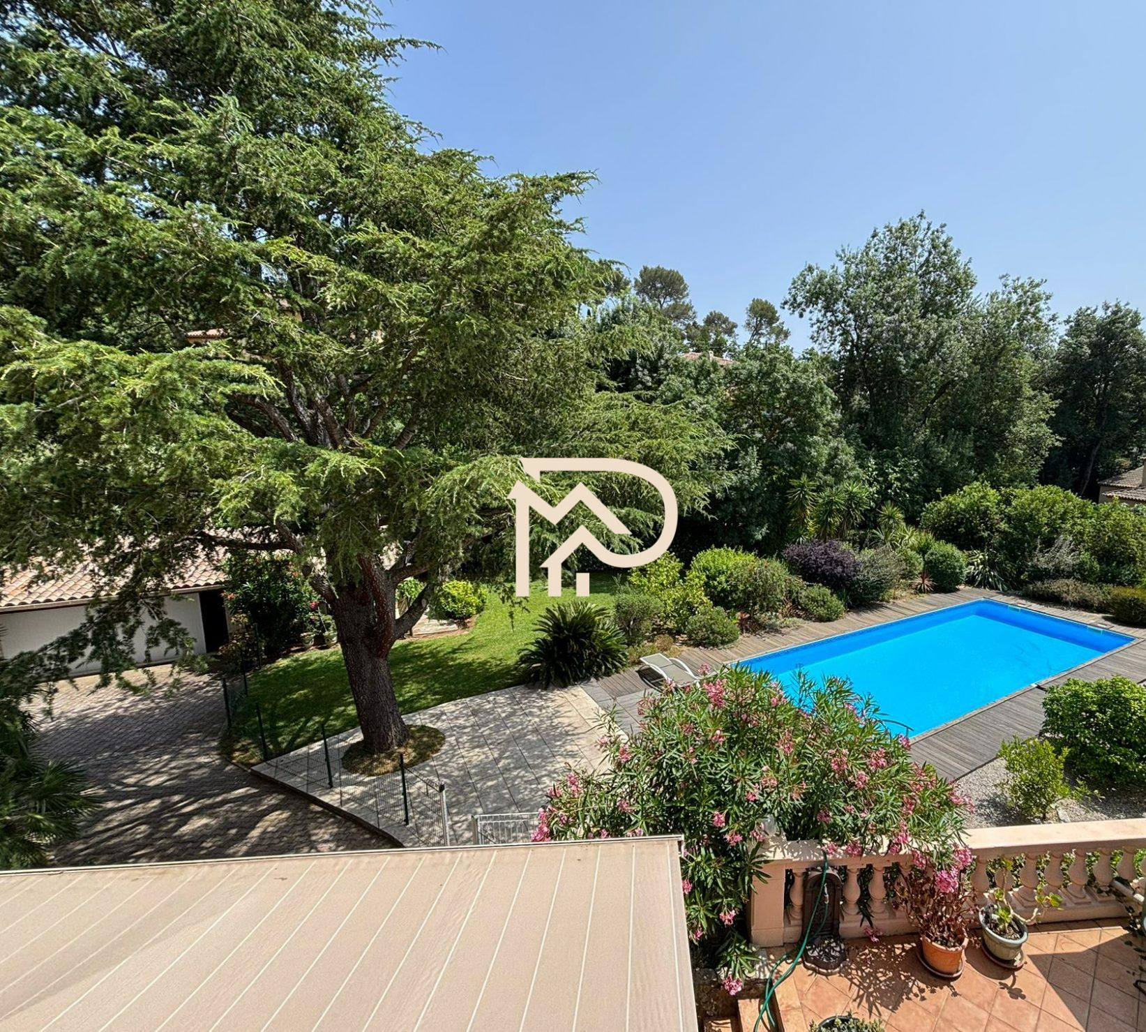 À vendre dans le très prisé quartier de l'Almanarre, élégante villa d'une superficie de plus de 165 m2. Idéalement située en impasse, cette propriété, entièrement climatisée, offre de plain-pied une vaste pièce de vie de plus de 65 m2, baignée de lumière grâce à de larges baies vitrées ouvrant sur une terrasse agrémentée d'une piscine chauffée. Vous y trouverez également une cuisine semi-ouverte, un bureau ainsi que deux chambres disposant chacune de leur salle d'eau. À l'étage, deux chambres supplémentaires s'ouvrent sur une terrasse et se partagent une salle d'eau. Édifiée sur un terrain plat, la villa bénéficie d'un garage, d'un espace de stationnement pouvant accueillir plusieurs véhicules, ainsi que d'un terrain de pétanque, idéal pour les moments de convivialité.