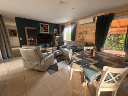 À Saint-Génis-des-Fontaines, villa 3 faces de plain-pied sur terrain de 375 m² dans lotissement calme, proche centre et commodités. Pièce de vie climatisée 36 m² avec poêle à granulés et cuisine équipée, 3 chambres, salle d'eau, WC séparé, buanderie. Deux terrasses dont une couverte, abri de jardin, parking. Double vitrage, volets roulants et portail électriques.