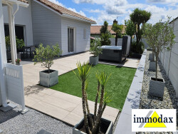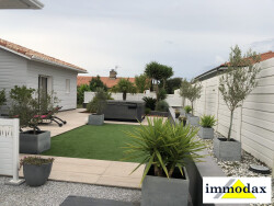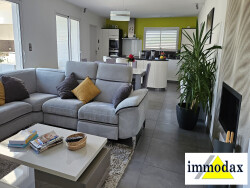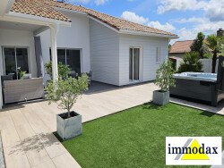 Sous compromis : Maison Contemporaine avec belles prestations. Cette maison contemporaine construite en 2016, allie modernité et confort. Avec une surface habitable de 127 m² et une surface au sol de 230 m², cette maison de plain-pied, avec un terrain de 1014 m² offre un espace de vie spacieux et lumineux. Le séjour salon de 50 m² avec sa cuisine ouverte aménagée et équipée est un endroit, parfait pour recevoir vos proches ou vous détendre en famille près de la cheminée Les 4 pièces, dont 3 chambres, sont conçues pour offrir un confort optimal. La suite parentale avec sa salle de bains et son dressing bénéficie d'un accès à la terrasse. La salle d'eau, ainsi que le WC indépendant, garantissent une intimité et une fonctionnalité parfaites. Profitez de deux terrasses avec une cuisine d'été totalisant 28 m², idéales pour les repas en plein air et les moments de détente. Le jardin, est parfaitement entretenu. Cette maison, en excellent état, est équipée d'un chauffage individuel et d'une cuisine américaine aménagée et équipée. Les ouvertures en aluminium et les portes à double vitrage assurent une isolation thermique et phonique optimale. Stores électriques. Conforme aux normes PMR, cette maison est accessible à tous. La vue sur le jardin et la terrasse offre une sensation de sérénité et de bien-être. Exposition sud-ouest, cette maison bénéficie d'une luminosité exceptionnelle tout au long de la journée. Le terrain est 'piscinable', et un SPA est déjà installé pour vous détendre. À proximité, vous trouverez plusieurs commodités pratiques. À seulement 5 minutes à pied, vous avez accès à deux lignes de bus, une crèche et un médecin généraliste. À 10 minutes à pied, une maternelle, une école élémentaire et un restaurant et des commerces vous accueillent. En voiture, plusieurs parcs et jardins, deux hôpitaux et un collège sont accessibles en 10 minutes. A découvrir sans tarder. Pas de travaux à prévoir. Vous posez vos valises.. Plus d'informations contacter: Thierry DUPRAT 07 68 51 33 00 Agent Commercial en Immobilier Agence IMMODAX. Indépendant et inscrit au RSAC de DAX 793 088 501