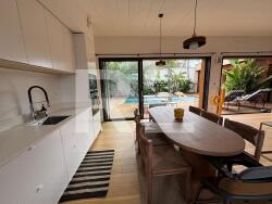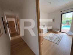 Une entrée avec placard, un espace de vie lumineux donnant sur la terrasse et la piscine avec cuisine équipée, une buanderie et un WC avec lave mains.