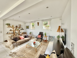 À l'étage principal : une vaste pièce à vivre baignée de lumière réunissant salon, salle à manger et cuisine américaine équipée, prolongée par une suite parentale avec salle de bain et dressing.