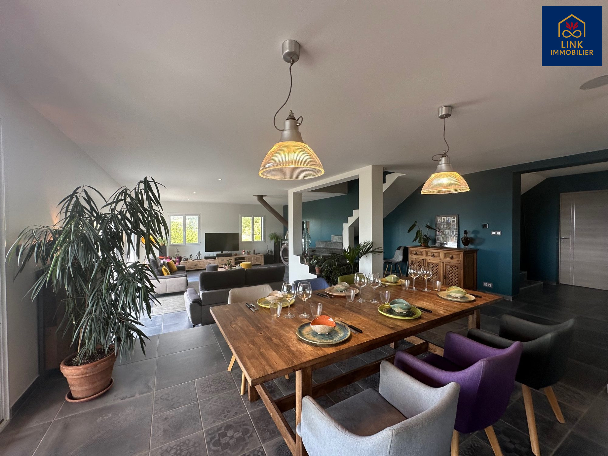 Dès l'entrée, la propriété séduit par ses volumes et sa luminosité. Le hall dessert une vaste pièce de vie d'environ 70 m², où la cuisine entièrement équipée s'ouvre harmonieusement sur l'espace salon/séjour. L'ensemble bénéficie d'un accès direct à une grande terrasse et à un jardin paysager, véritable écrin de verdure entouré de chênes, offrant une intimité totale et rare sur le secteur.