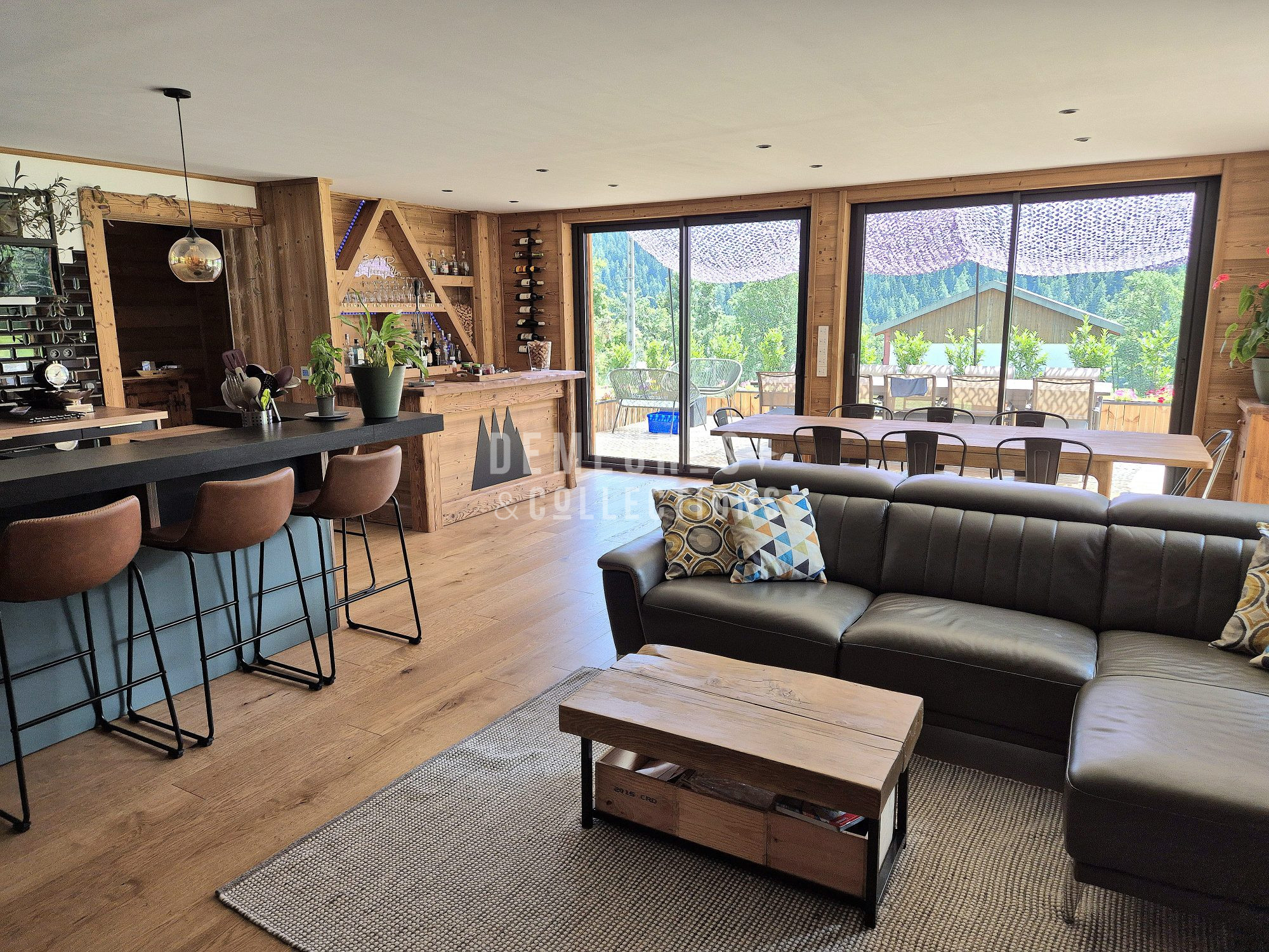 Érigée sur un terrain de 621 m², la propriété déploie près de 386 m² de surface totale (270 habitables) répartis sur trois niveaux avec des espaces optimisés. Le séjour lumineux avec cuisine américaine (près de 57 m²) s'ouvre sur une terrasse et une piscine à débordement offrant une vue dégagée sur la nature environnante.