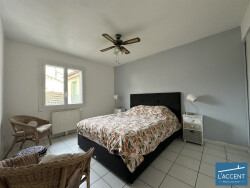 L'espace nuit de plain-pied se compose de deux chambres, d'un bureau (idéal télétravail ou chambre d'appoint) ainsi que d'une salle d'eau et d'un WC séparé. A l'étage, accessible depuis la pièce de vie avec un joli escalier en bois, une vaste chambre.