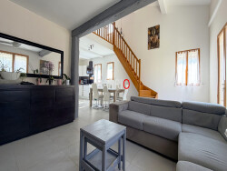 Le volume cathédral du salon apporte une belle sensation d'espace et laisse circuler la lumière jusqu'à l'étage où l'on retrouve une seconde partie nuit composée de deux chambres, dont une avec dressing, un coin bureau mansardé ainsi qu'une salle de bain avec WC.