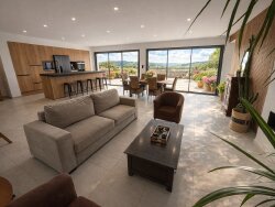 Villa contemporaine de plain-pied, à l'abri des regards, sur un versant sud-ouest avec piscine chauffée, confort et vues imprenables. Parfaitement située sur une petite colline, en lisière d'un bourg avec commerces et commodités, cette superbe villa neuve de plain-pied bénéficie d'une vue exceptionnelle sur les vignobles environnants et sur un magnifique paysage vallonné et Méditerranéen. Ici on profite chaque jour, dans un environnement calme et privilégié, de couchers de soleil magnifiques. La propriété est bénéficiaire d'une situation centrale et se situe à seulement 17 kilomètres de Béziers et de son aéroport international, à 30 kilomètres des plages de la Méditerranée et à 19 kilomètres de la charmante ville historique de Pézenas. Un emplacement parfait alliant tranquillité et accessibilité. Conçue avec une attention particulière portée au confort et à la luminosité, la villa offre un cadre de vie moderne et élégant. Entièrement de plain-pied, elle comprend un très grand séjour de type « open space », un home cinéma, une salle de jeux, quatre chambres spacieuses et quatre salles d'eau / bains raffinées, garantissant intimité et confort pour les propriétaires ainsi que pour les invités. La maison est équipée de tout le confort contemporain. Implantée sur un magnifique terrain de 1.780 m², au calme et facile d'entretien, la propriété offre une situation privilégiée, à l'abri des regards. Les vastes terrasses vous permettent de profiter pleinement des vues et de l'art de vivre méditerranéen. Le portail électrique, le grand garage carrelé, le terrain de pétanque, le potager et bien sûr la piscine chauffée et équipée d'un système de nettoyage à l'électrolyse complètent l'ensemble. Une propriété rare qui combine emplacement, confort, intimité et vues exceptionnelles idéale en résidence principale ou éventuellement comme résidence secondaire de prestige. Offre exceptionnelle. Informations supplémentaires sur demande. Visites sur rendez-vous.