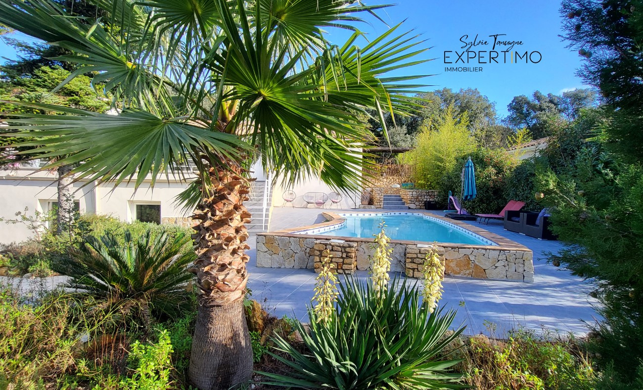Villa de plain-pied avec piscine chauffée et vues.