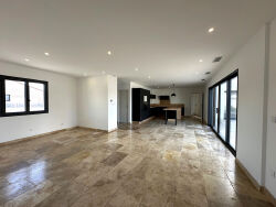 Cette villa proposée à la location est située sur les hauteurs de Couffoulens, dans un environnement résidentiel structuré au sein d'un petit lotissement. Le logement de plain-pied développe une surface de 138m² et s'inscrit sur une parcelle close de 618m² aménagée pour un usage quotidien extérieur. L'entrée distribue une penderie ainsi qu'une buanderie de grande capacité, facilitant l'organisation du logement. La pièce de vie centrale offre un volume ouvert et lumineux, intégrant une cuisine entièrement équipée. La baie vitrée assure une continuité directe avec la terrasse, permettant une utilisation fluide des espaces. La maison est organisée autour de deux zones nuit distinctes, adaptées à une occupation familiale. Le premier espace comprend deux chambres séparées par une salle de bains équipée d'une baignoire, d'une douche italienne et d'un WC. Le second espace accueille une chambre parentale avec salle d'eau privative et emplacement dressing, une chambre complémentaire et un WC indépendant. Le logement est équipé d'un grand garage à porte motorisée, d'une climatisation gainable et d'un cumulus thermodynamique assurant une classe énergétique A. Les finitions incluent du travertin au sol et dans les salles d'eau, ainsi qu'un équipement électroménager encastré. Le jardin, aménagé avec des plantations, des zones gravillonnées et engazonnées, bénéficie d'une vue dégagée sur les Pyrénées, offrant un cadre d'occupation équilibré entre confort intérieur et usage extérieur.