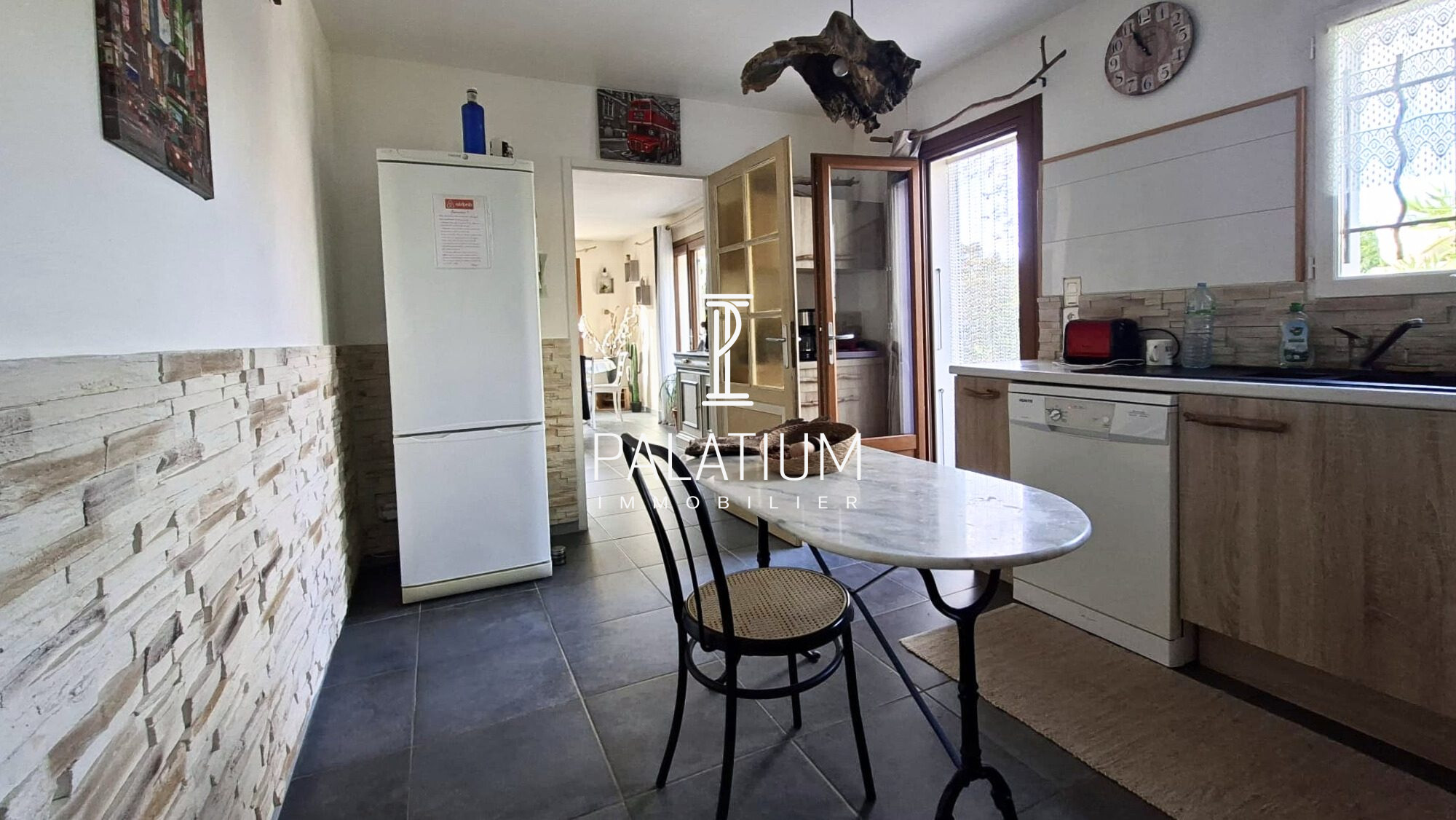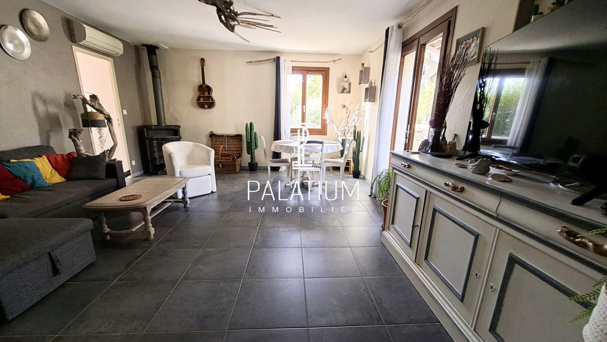 Grand salon ouvrant sur terrasse ensoleillée.