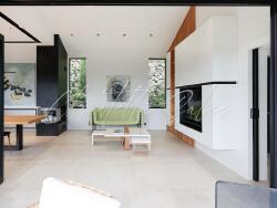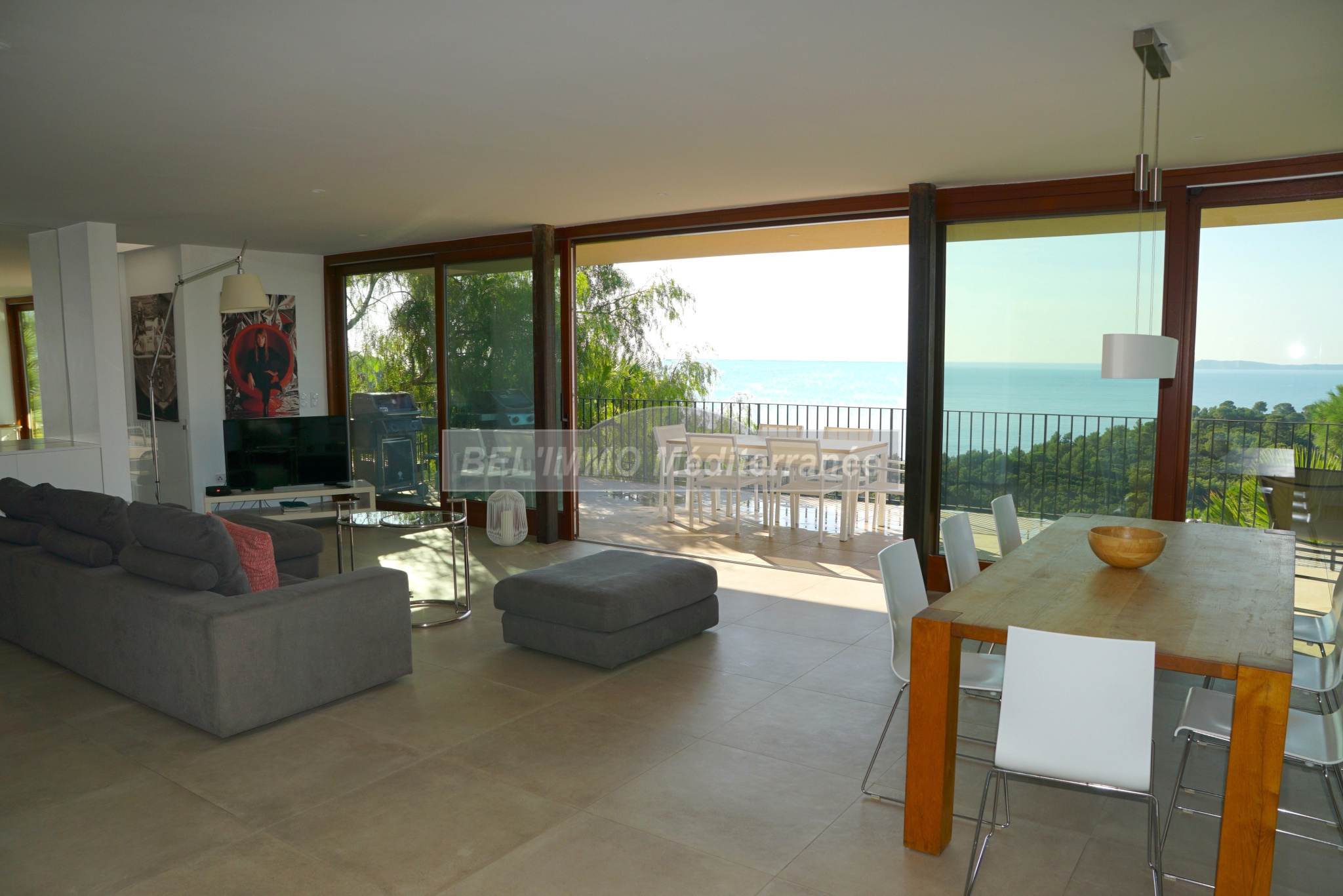 Double séjour lumineux avec de larges baies vitrées, prolongé par un patio de 42 m².