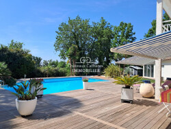Le séjour de 100 m² au total, baigné de lumière grâce à ses larges ouvertures, est le coeur de cette demeure de prestige. La cuisine américaine, aménagée et équipée, ravira les amateurs de gastronomie et de convivialité. Elle s'ouvre totalement, grâce à une large baie à galandage, sur une terrasse de 200 m² et une piscine aux dimensions hollywoodienne. Idéal pour profiter des beaux jours en compagnie de vos proches. Une pièce dédiée avec jacuzzi vous permettra aussi de beaux moments, même et surtout en hiver !
