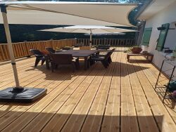 ? **Un Extérieur à Couper le Souffle** À l'extérieur, l'enchantement continue. Imaginez-vous, au petit matin, déguster votre café sur la **terrasse de 110 m²**, bercé par le chant des oiseaux et l'air pur de la campagne. Cette terrasse, à la fois spacieuse et intimiste, est le lieu idéal pour des moments de détente en famille ou entre amis, sous le regard bienveillant d'un ciel infini.