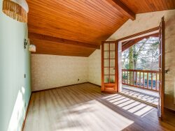 À l'étage : Trois chambres, dont une avec balcon Une salle d'eau Un WC indépendant Des espaces de rangement dans les combles