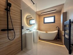 L'espace nuit offre trois chambres dont une suite parentale raffinée avec parquet en chevron, dressing sur mesure et une salle d'eau avec meuble bois, vasque en pierre naturelle et douche à l'italienne. Une salle de bain avec une deuxième douche, une baignoire îlot et des vasques design.