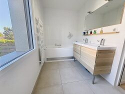 À l'étage, deux grandes chambres traversantes équipées de placards intégrés (dont l'une bénéficie de sa propre terrasse privée). Un bel espace central polyvalent à aménager selon vos besoins (bureau, chambre d'appoint, salle de jeux...). Une salle de bains avec douche à l'italienne et toilettes séparées. Pour votre confort, l'étage est équipé d'une climatisation réversible. La maison comporte également une cave en sous-sol avec un chauffe-eau thermodynamique, un garage indépendant et bénéficie de deux espaces jardins distincts (à l'avant et à l'arrière de la maison), permettant de profiter de l'extérieur. Superficie totale du terrain 333 m2. Maison raccordée à la fibre. Un bien rare où il fait bon vivre, sans travaux à prévoir.