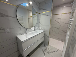L'entrée lumineuse ouvre sur un vaste séjour sublimé par un parquet en chevrons et un plafond cathédrale, où la cuisine équipée et sur-mesure s'intègre harmonieusement.