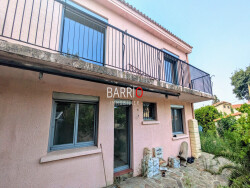À l'étage, une vaste pièce à vivre baignée de lumière profite d'une vue imprenable sur les Albères grâce à deux baies vitrées ouvrant sur un grand balcon. Deux chambres, une salle d'eau et un wc séparé complètent cet espace convivial.