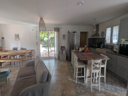 Imaginez-vous dans cette villa spacieuse et lumineuse, où chaque pièce a été conçue pour votre confort. La cuisine américaine aménagée et équipée est un véritable atout pour les amateurs de gastronomie, elle est ouverte sur le séjour spacieux, lumineux et climatisé. Les trois chambres offrent un espace de vie intime et confortable, la salle d'eau a été rénové récemment et offre une jolie douche italienne.