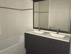 La partie duplex reçoit 2 chambres avec ensemble penderie/étagères faisant respectivement 12.55m² et 9.35m². Une salle de bains avec baignoire, double meuble sous vasques et miroir lumineux, sèche serviette.