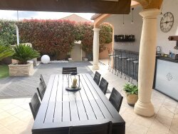 Superbe villa T5 de plain pied développant env. 150 m² de surfaces habitables à l'architecture traditionnelle languedocienne. Nous sommes immédiatement séduits par cet ensemble immobilier qui se voit sublimée par une décoration délicate au style néanmoins affirmé où tout a été pensé afin d'apporter élégance, confort et sécurité. Elle reflète parfaitement l'ame des propriétaires ou le sens du détail et la qualité des matériaux régnent en harmonie.Un salon et une cuisine ouverte spacieuse au sein de cet espace généreux avec une belle cuisine contemporaine, ou tout est tiré au cordeau. La sphère privée s'articule autour de 4 chambres avec une salle d'eau. À l'extérieur, l'architecte a permis à la végétation de prendre place tout en structurant les lignes de construction. Dès qu'arrivent les beaux jours, la maison prend alors une nouvelle dimension où la terrasse devient incontournable et idéale pour profiter des rayons du soleil au bord de la piscine ( hors-sol) tout au long de l'année et de la cuisine d'été. Un grand garage et un local pour les cycles ou une salle de sport complétent le tout. Possibilité de garer un camping car au sein de la propriété. Les plus: pompe à chaleur, chauffage au sol ( chaud et froid), panneaux photovoltaique, climatisations,alarme, de belles prestations pour cette villa. tel:0603484623