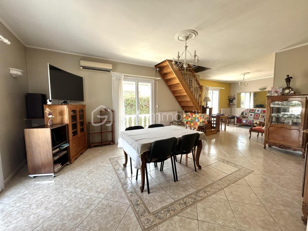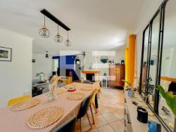 De plain-pied, elle offre une belle pièce de vie avec cheminée et climatisation, donnant sur une terrasse plein-sud.