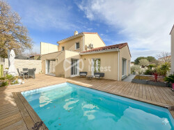 La pièce de vie s'ouvre sur un agréable extérieur paysagé, exposé SUD-OUEST, offrant un véritable havre de paix avec terrasse en bois exotique, piscine et espace vert.