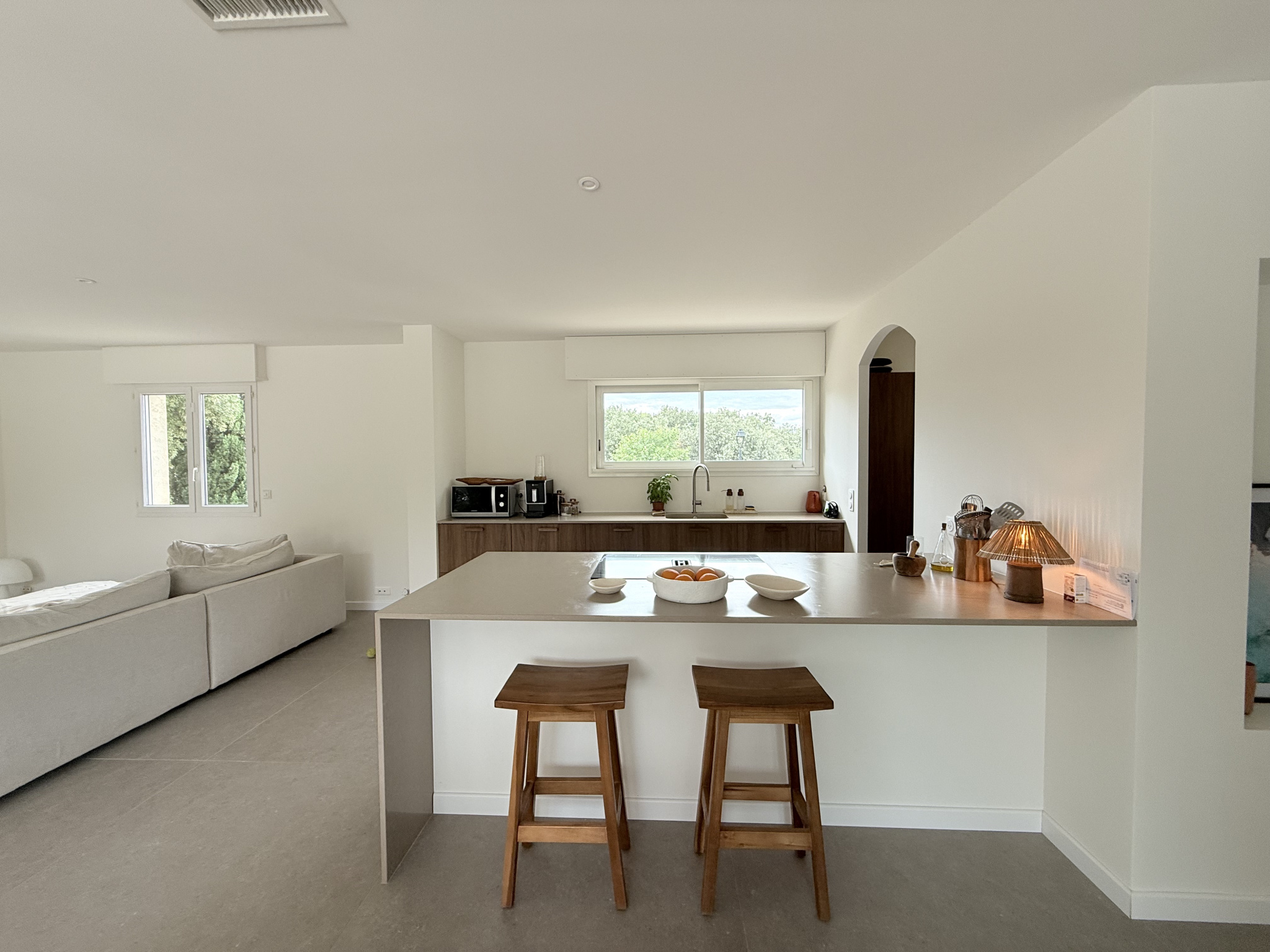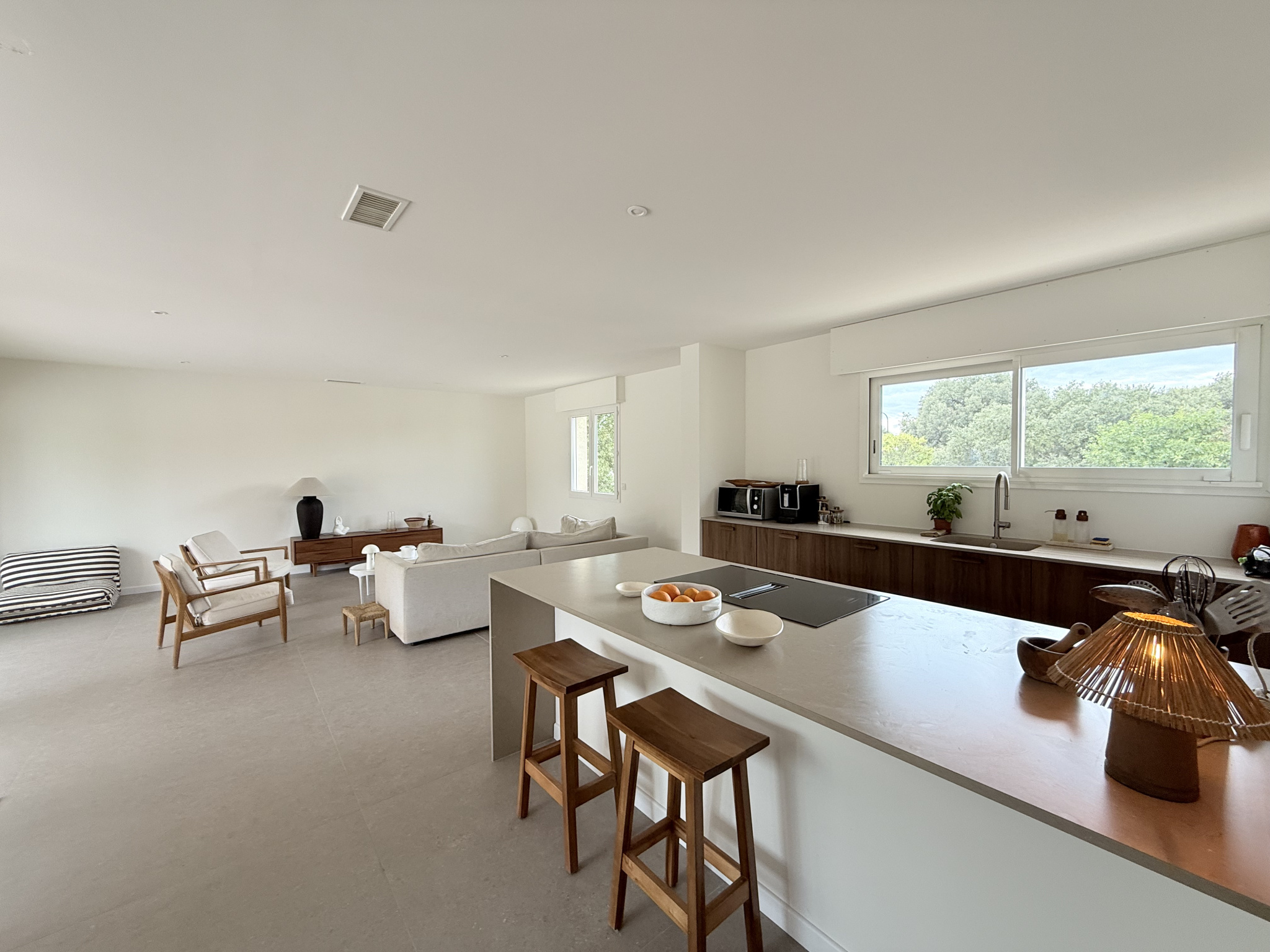 Quelques finitions restent à prévoir, notamment les peintures ainsi que les aménagements extérieurs (en particulier la terrasse, pour laquelle une projection avec un revêtement bois a été réalisée sur les photos).