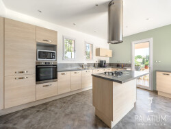 D'une superficie habitable d'environ 152 m², la villa s'étend sur deux niveaux. Au rez-de-chaussée, l'entrée s'ouvre sur une grande cuisine moderne, parfaitement agencée pour les moments conviviaux. Le vaste séjour de 50 m², baigné de lumière grâce à son exposition plein sud, offre un cadre de vie spacieux et accueillant. Cet espace se prolonge naturellement vers une terrasse en travertin de plus de 50 m², offrant une vue dégagée sur la piscine et la campagne environnante, sans aucun vis-à-vis. Une suite parentale avec salle d'eau complète ce niveau, offrant un confort optimal.