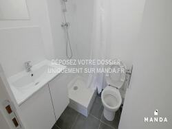 La salle d'eau est équipée d'un lavabo avec un miroir, d'une douche, d'espaces de rangement et d'un W.C.