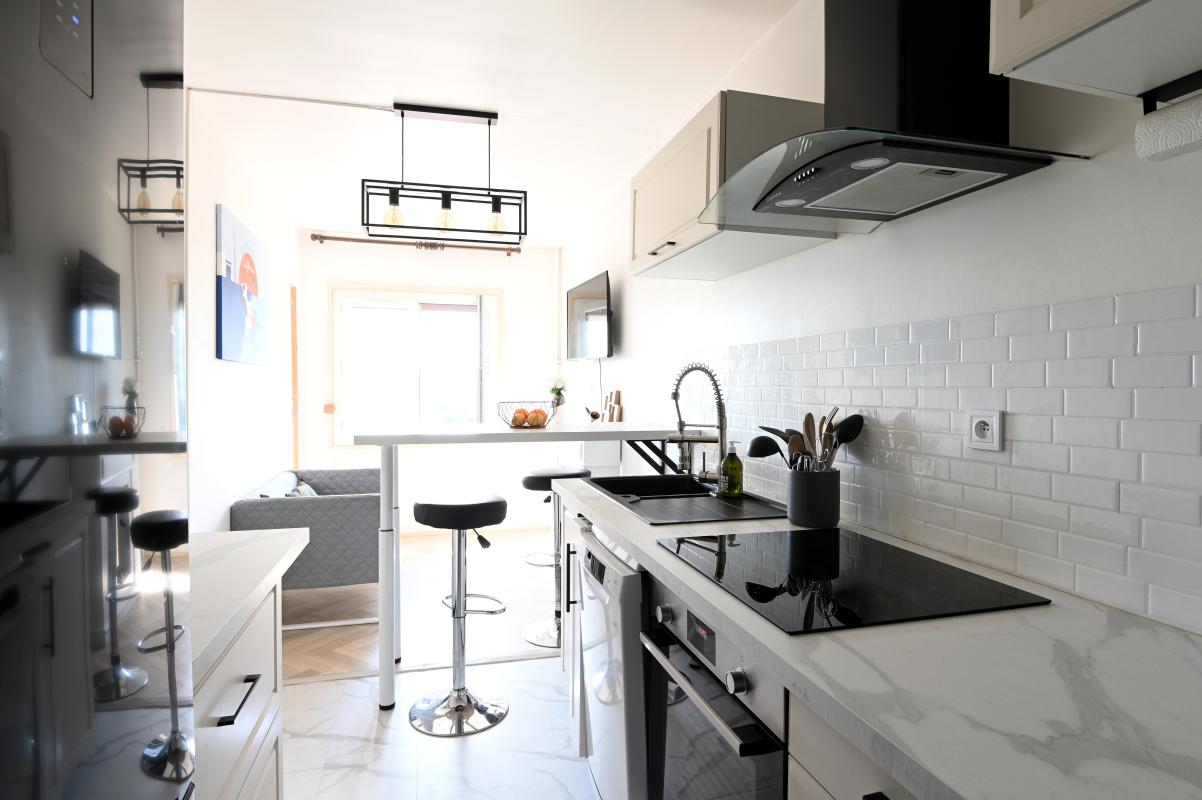 La cuisine est équipée d'un four, de plaques de cuisson, d'une hotte, d'un réfrigérateur congélateur et d'un lave-vaisselle.