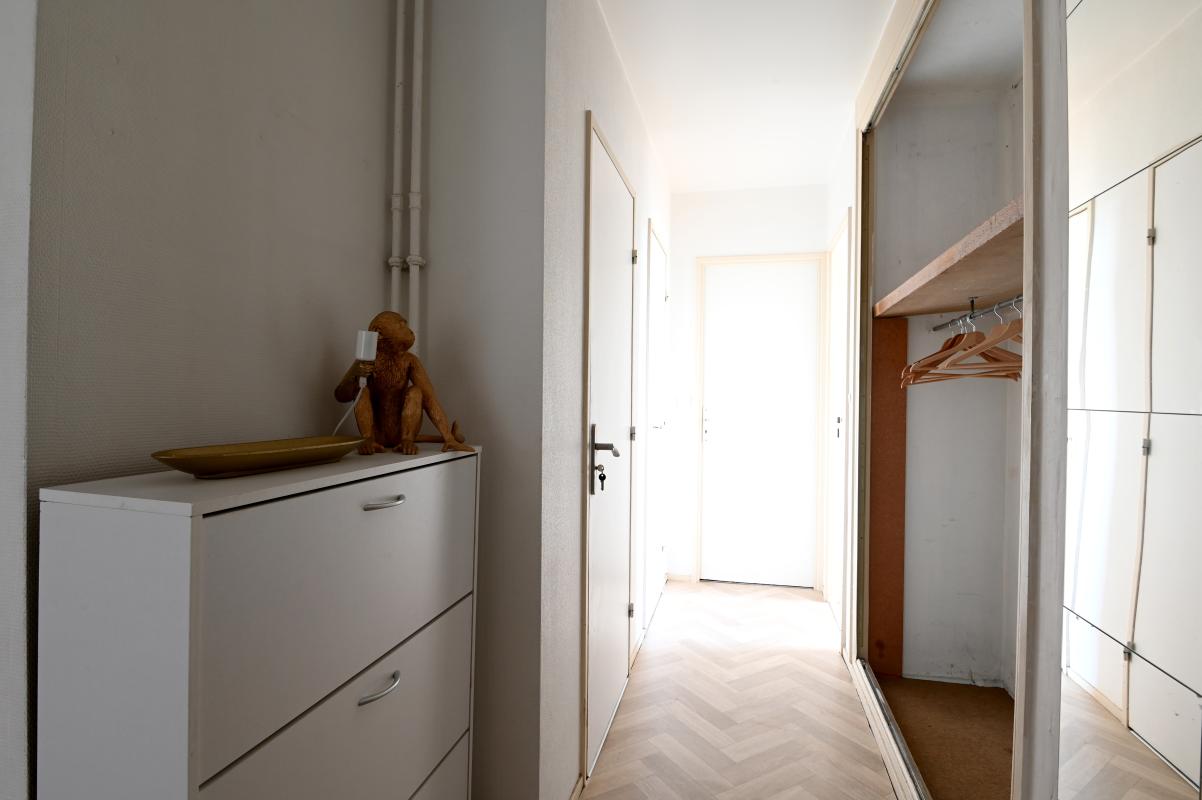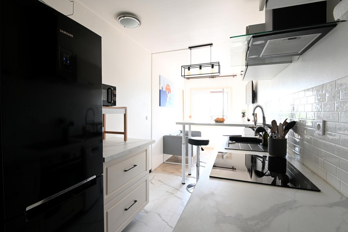 L'appartement est composé d'une entrée d'un salon, de 2 chambres, d'une cuisine ouverte, d'une salle de bain avec baignoire et lave-linge et de WC séparés.