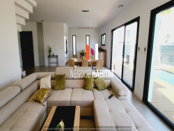 VILLETELLE / L' Agence Négoce habitat vous présente cette Villa contemporaine T5 de 160m2 estimé composé au rdc d'une grande pièce de vie de 63m2m2 avec cuisine ouverte, 1 suite parentale avec sde + dressing de 25m2 et d'un WC. A l' étage 3 grandes chambres avec placard une salle de bain et un WC. Chauffage par pompe à chaleur AIR/AIR, garage de 18.33m2. Côté extérieur, terrain clos et aménagé de 450m2 avec piscine et terrasse en bois. A voir sans tarder. Réf FA 3920 Tarif : 500 000EUR frais d'agence inclus charge vendeur. Tél : 04 99 77 11 25 Port : 06 14 91 07 60 www.negoce-habitat.com