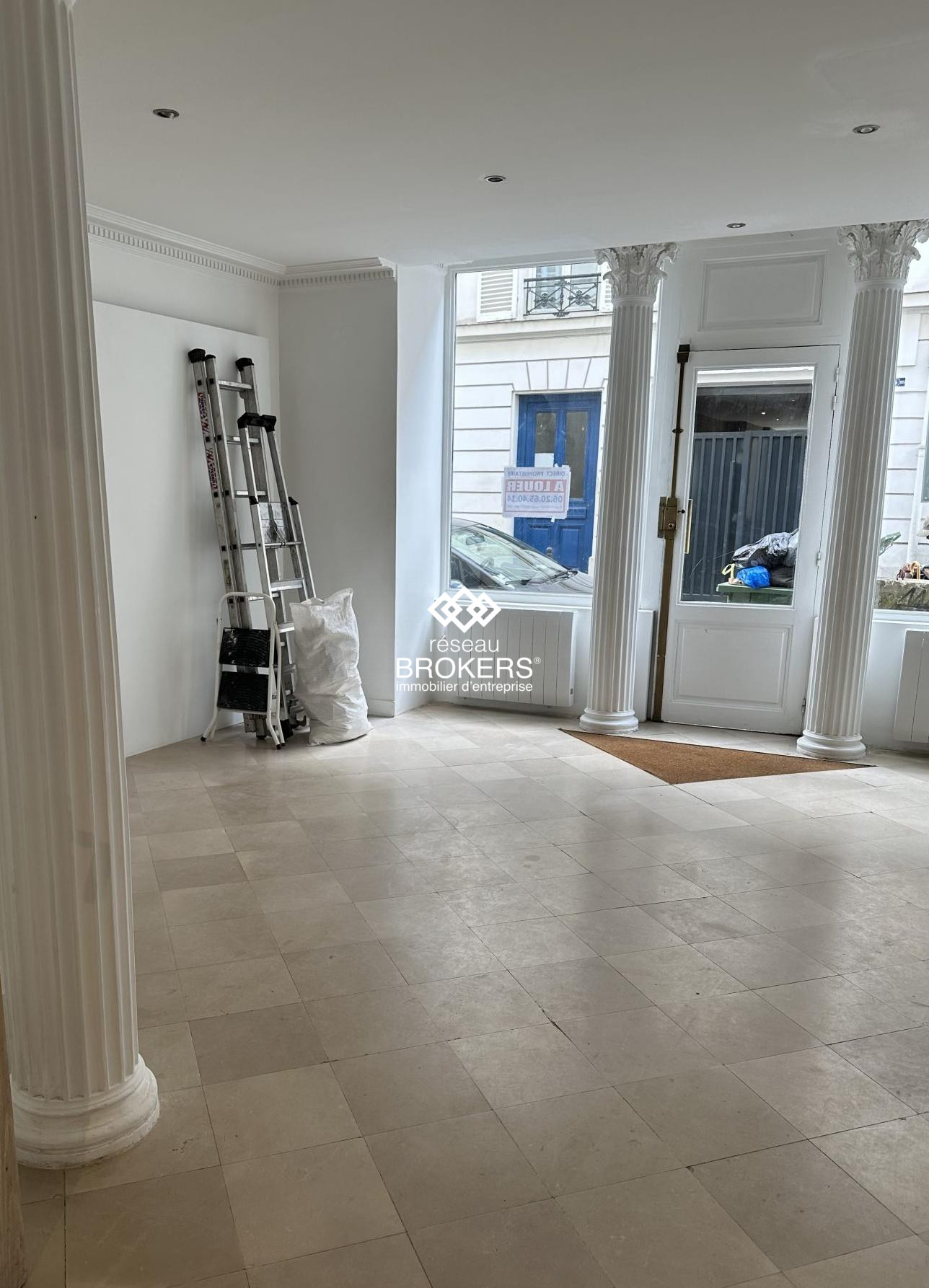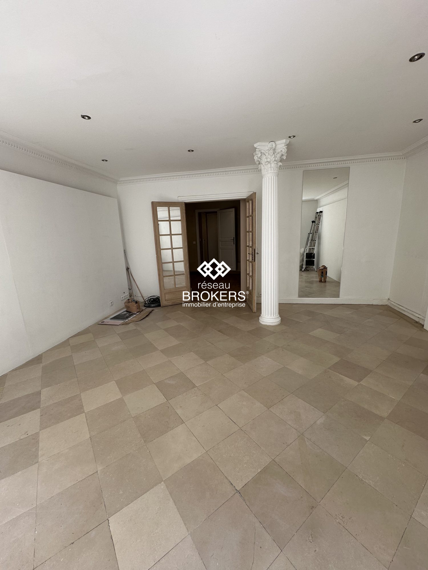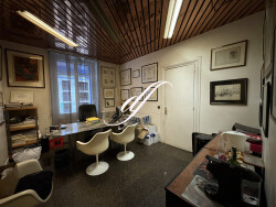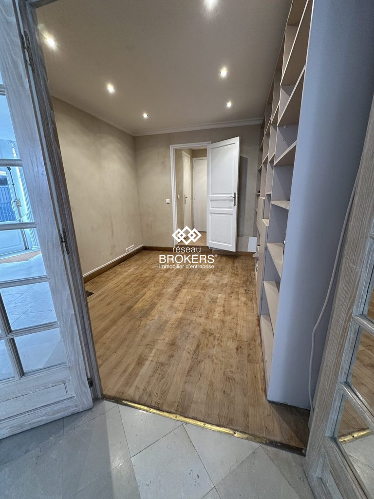 Ce local dispose d'une surface de 45 m² avec une vitrine linéaire de 9 mètres. Il se compose d'un espace d'entrée avec trois bureaux d'accueil, suivi d'une belle salle de réunion ou d'un grand bureau, offrant une belle hauteur sous plafond.