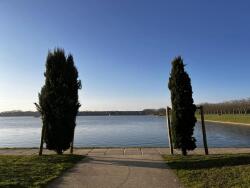 Entrée, wc séparé, salle de bains, séjour avec double exposition parc et lac, cuisine donnant sur le lac, 2 chambres.