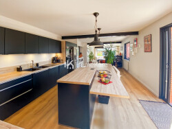 L'espace intérieur est doté d'une entrée avec rangements, puis d'une pièce de vie de plus de 70 m2, où les poutres métalliques structurent l'espace avec élégance. Le parquet en bois confère une ambiance chaleureuse, contrastant avec la modernité de la cuisine ouverte. Le salon, agrémenté d'un insert, s'ouvre entièrement sur le jardin par une large baie vitrée. La cuisine se prolonge vers une arrière-cuisine/buanderie très spacieuse.