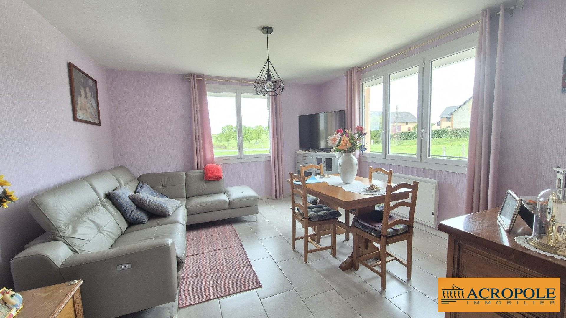 ...A l'avant de ce bien, situé près d'une route peu passagère, une terrasse carrelée offre une vue...