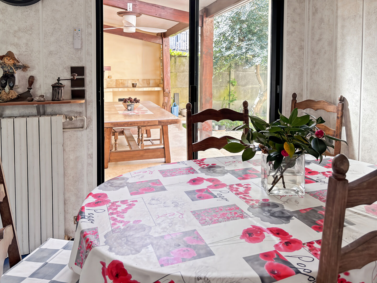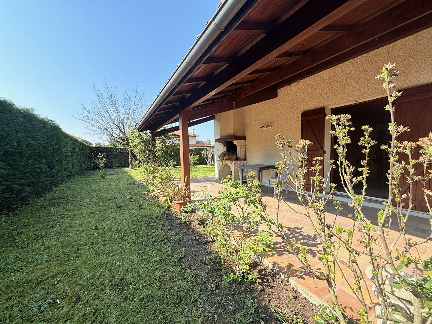 ...A l'extérieure , sur un terrain de 960 M2 , un jardin avec terrasse couverte , cuisine d'été ,...