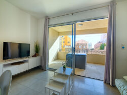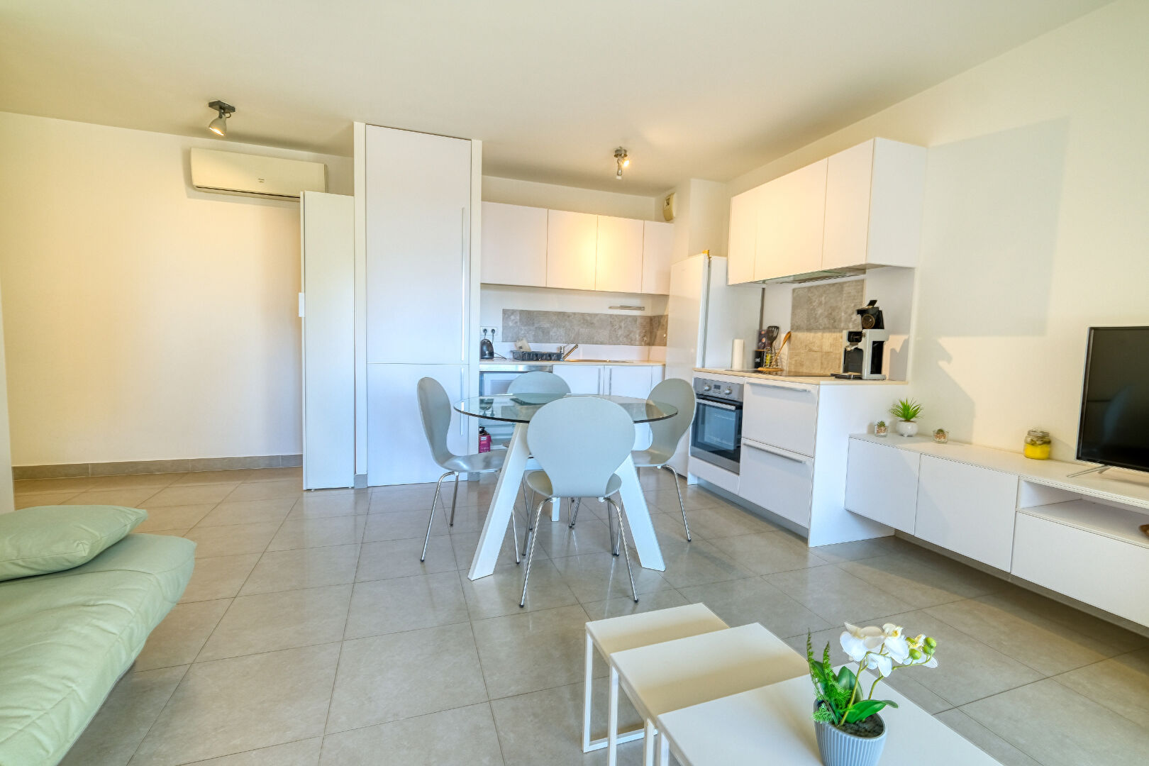 ...Coté jour, l'appartement se compose d'une entrée, d'un lumineux séjour climatisé et disposant...