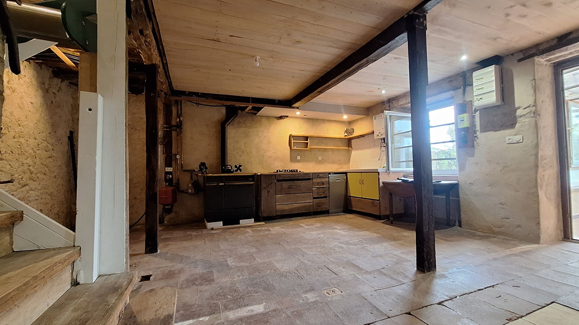 ...Maison en pierre en cours de rénovation comprenant une grande pièce de vie avec insert et une...
