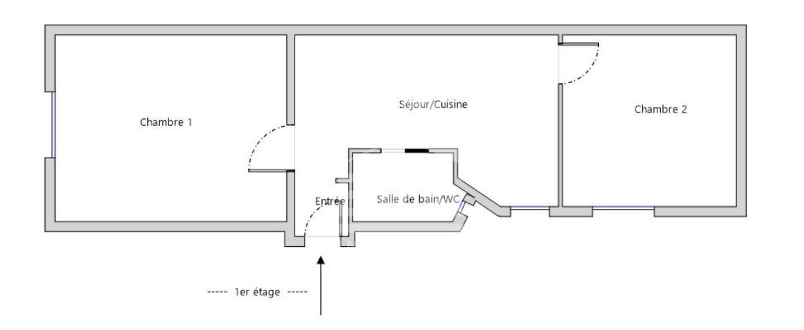 ...Le premier niveau dessert une entrée, une grande chambre de 19m² dotée de nombreux rangements et...