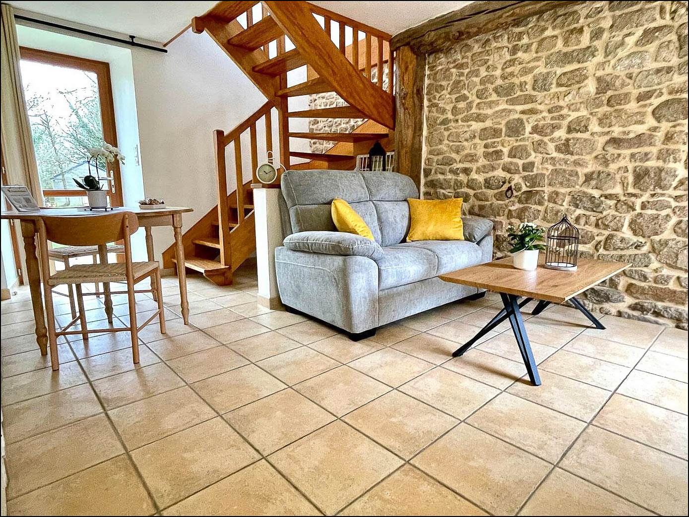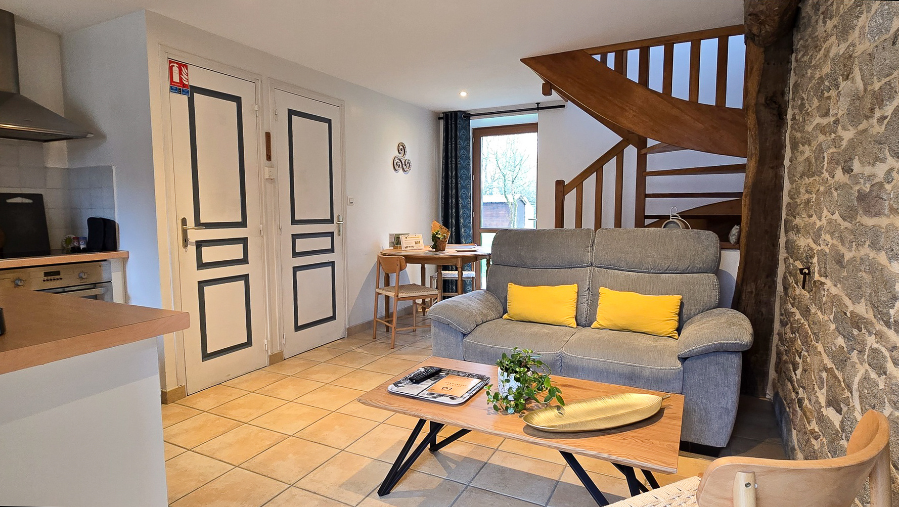 ...Elle comprend une pièce de vie lumineuse de 35 m² avec poêle à bois, coin cuisine aménagée et...
