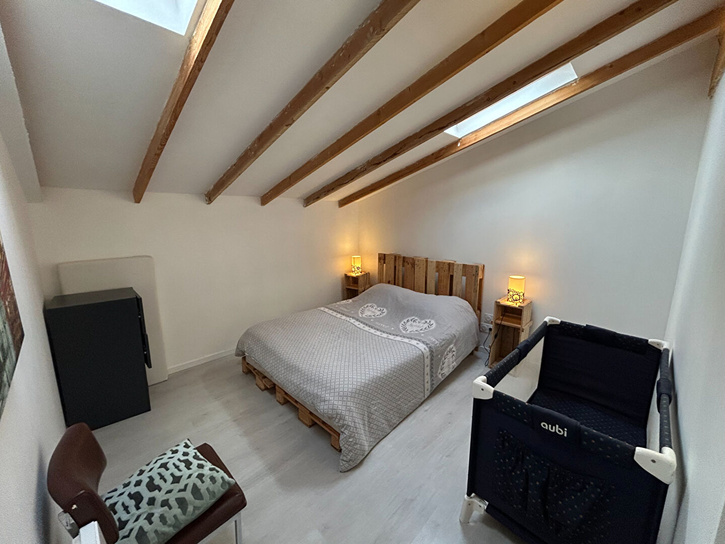 ...Séjour lumineux avec poêle à bois + climatisation réversible 2 chambres confortables Salle...