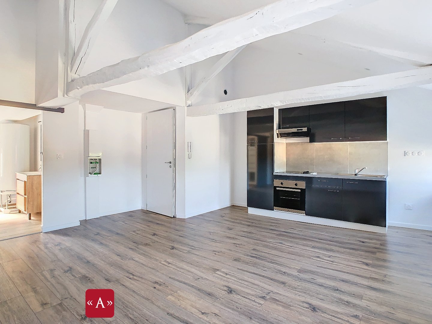 ...Espace-vie lumineux, cuisine ouverte équipée, belle chambre avec placard, salle de bains...