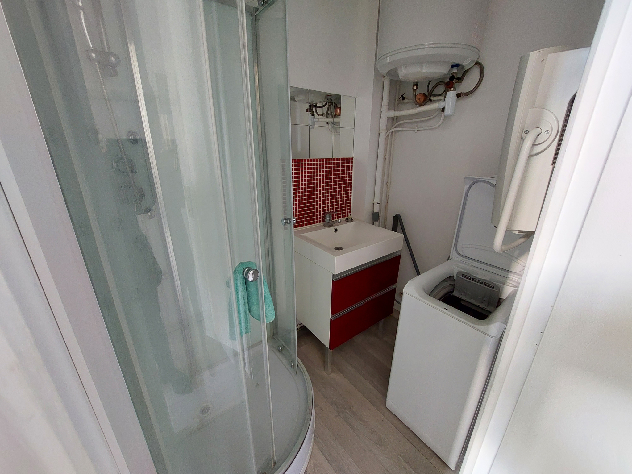 ... de vie avec lit mezzanine, canapé, TV, table, chaise), une salle de douche avec lave linge, WC sépa...